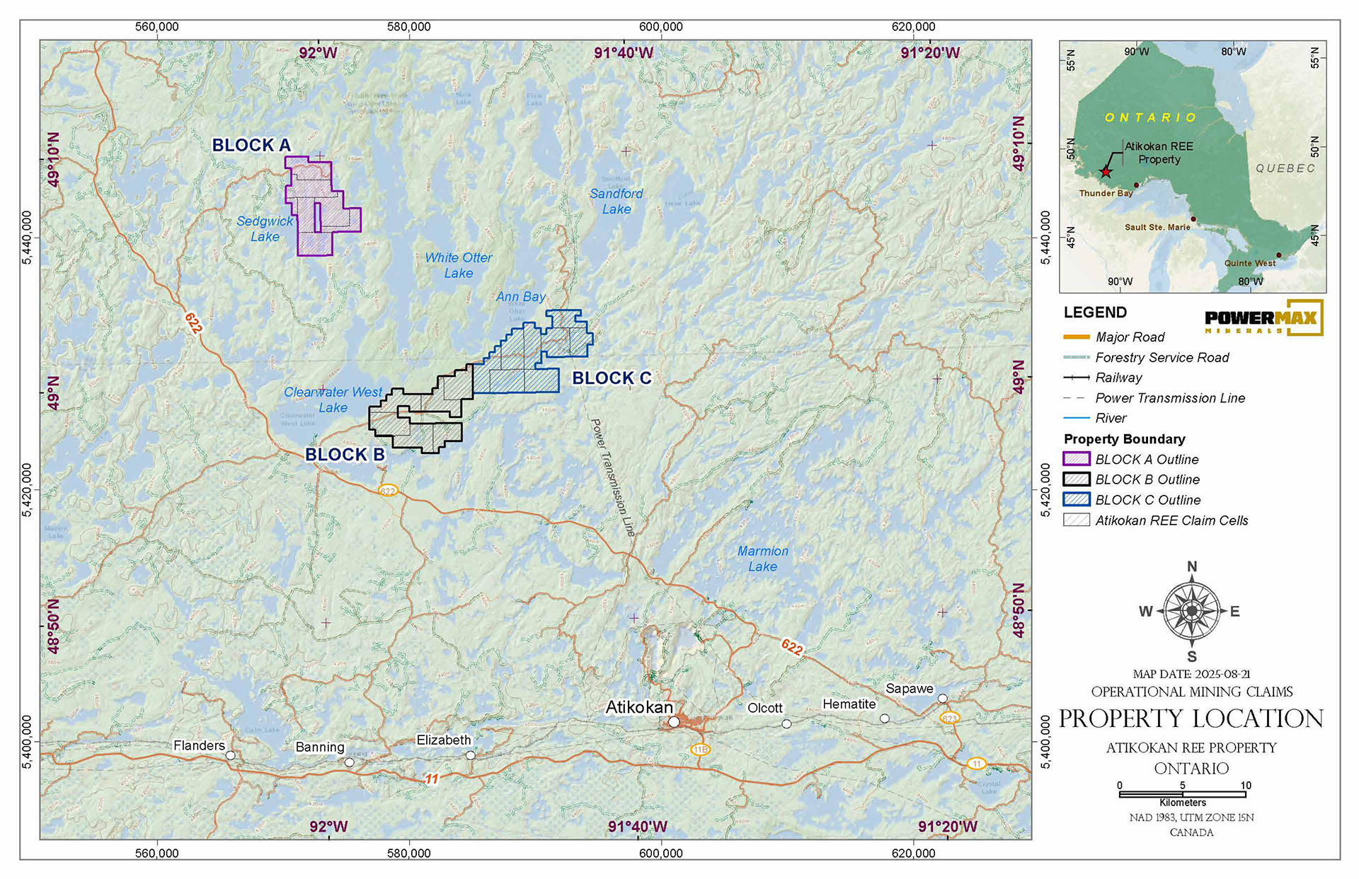 Block A falls within the White Otter Batholith whereas Blocks B and C are within a 5km buffer of the White Otter Batholith.